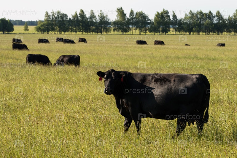 Стадо коров породы черный ангус (абердин-ангус) на свободном пастбище на зеленом лугу