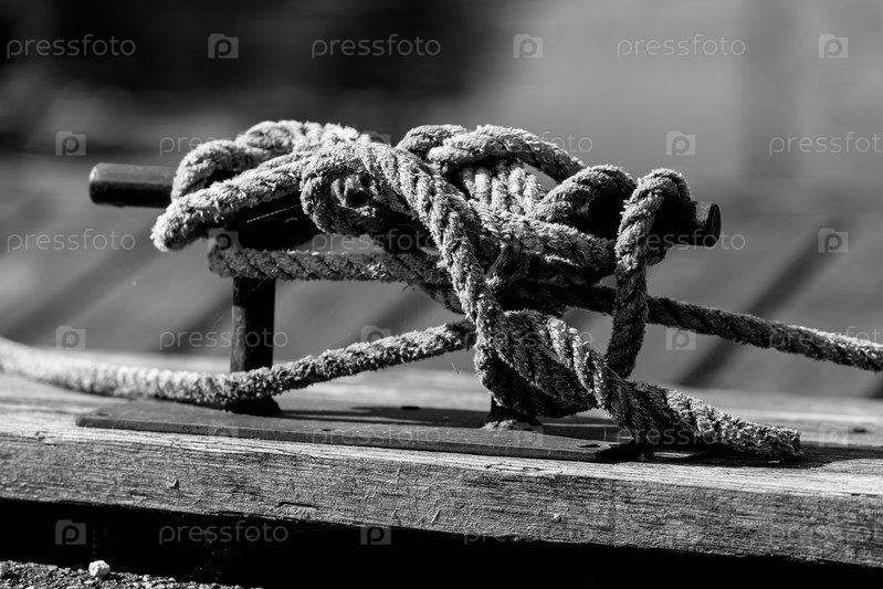 Канат, намотанный на поперечную планку на пирсе, черно-белый