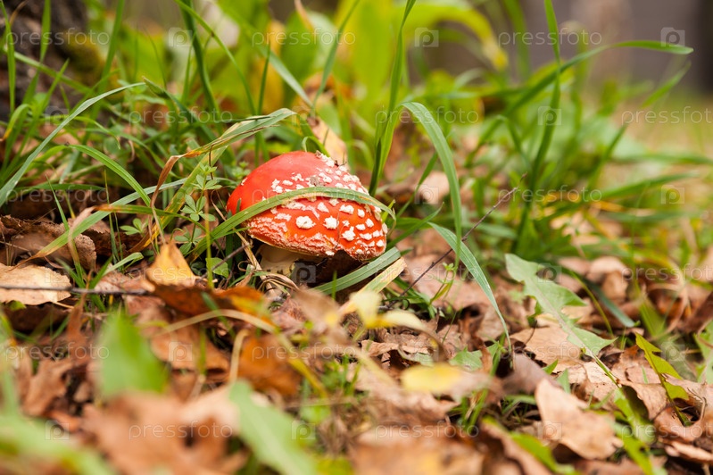 Мухомор в зеленой траве и опавших листьях