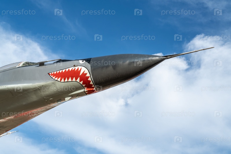 Боевой самолет истребитель-бомбардировщик на фоне голубого неба