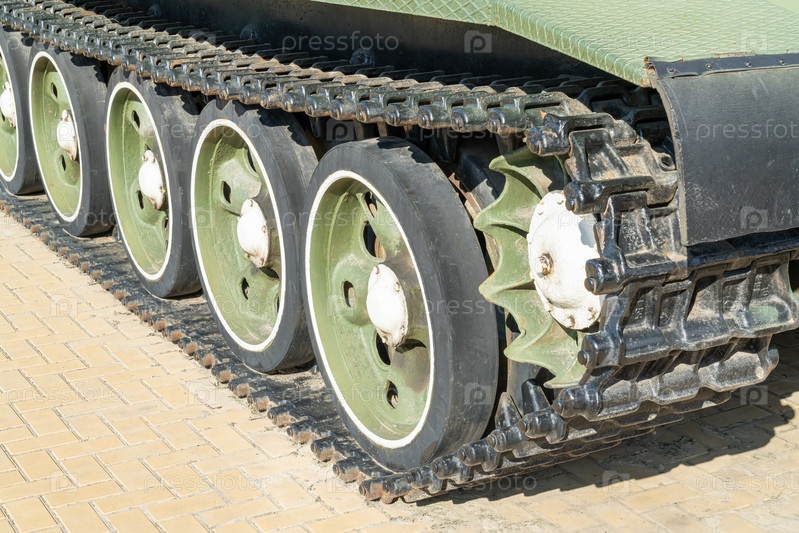 Зеленый танковый трак крупным планом на асфальте