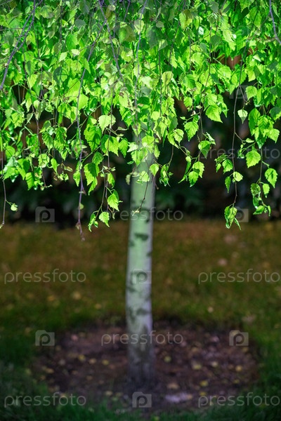 Береза подсвечена изнутри ночью