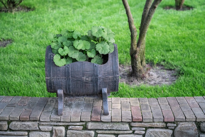 Деревянная бочка-кашпо с зелеными растениями на каменной стене в саду