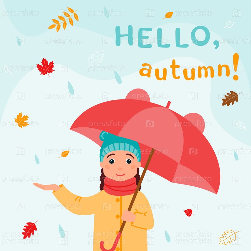 Радостная девочка в осенней одежде прячется под зонтиком от дождя и ловит капли