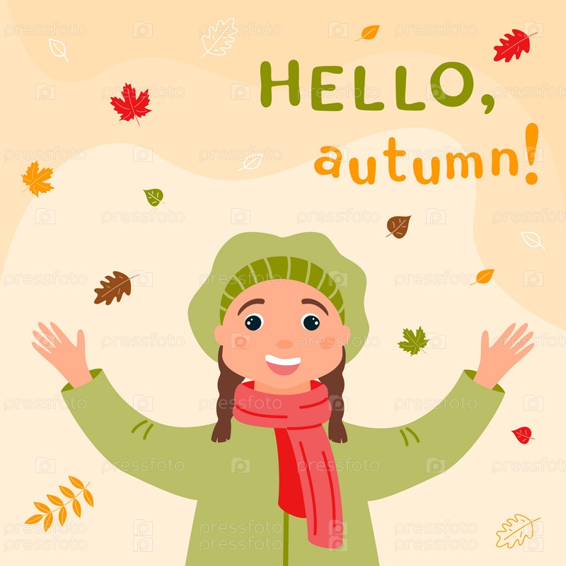 Квадратный фон Привет, Осень! Счастливая девушка в осенней одежде ловит падающие разноцветные листья