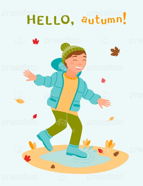 Плакат А4 Здравствуй, осень! Счастливый мальчик в осенней одежде прыгает по лужам
