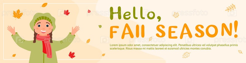 Баннер Здравствуй, осень! Счастливая девочка в осенней одежде ловит падающие разноцветные листья