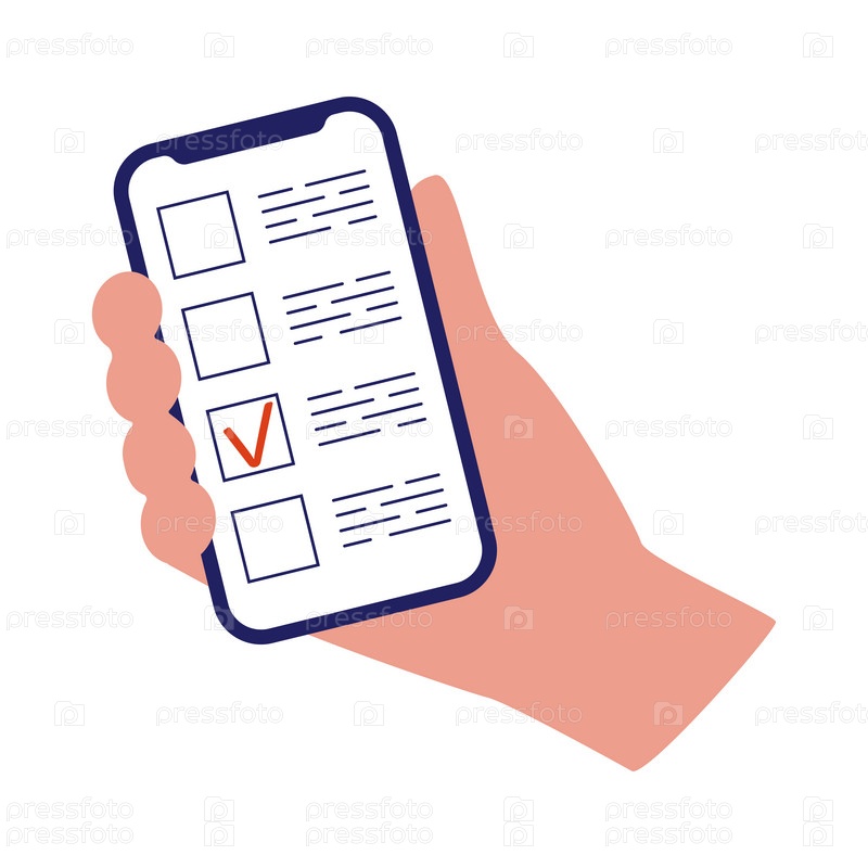 Голосование онлайн. Рука держит телефон с электронным бюллетенем для голосования