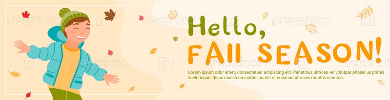 Баннер Привет, осень! Счастливый мальчик в осенней одежде с распростертыми объятиями