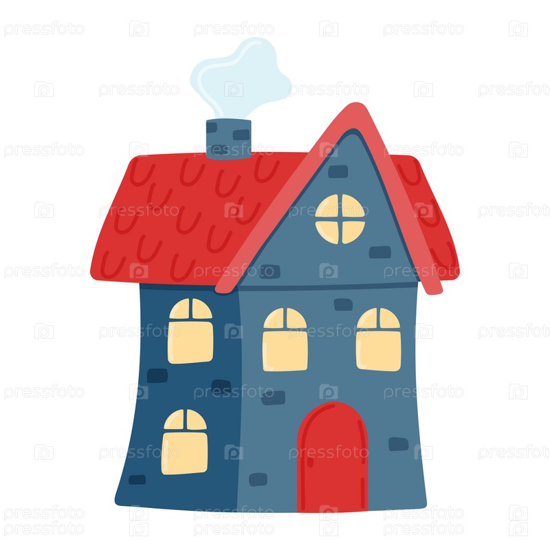 Синий дом с красной крышей и трубой. Вид спереди. Детский дом изолирован на белом фоне