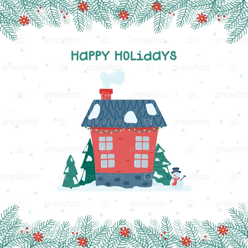 Открытка с праздниками. Милый рождественский и зимний домик