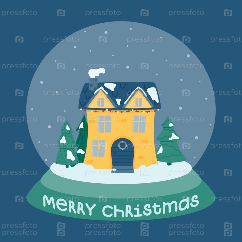 Счастливого Рождества. Милый зимний домик. Стеклянный шар с украшенным домиком