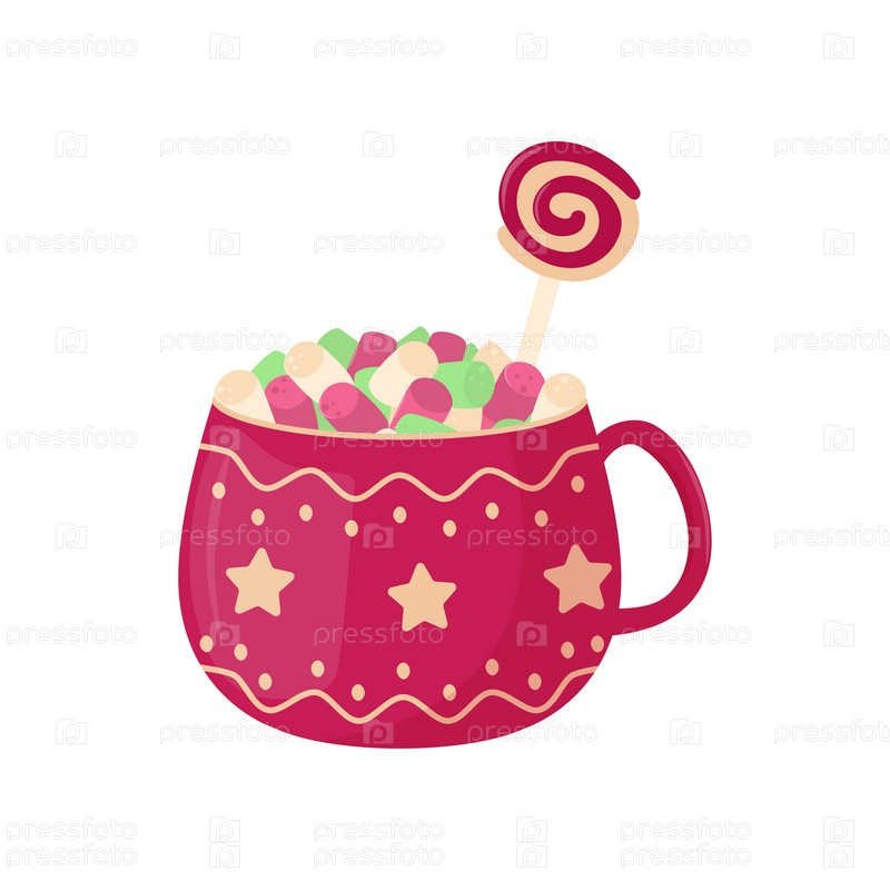 Красная чашка с зефиром и карамелью. Уютный зимний напиток