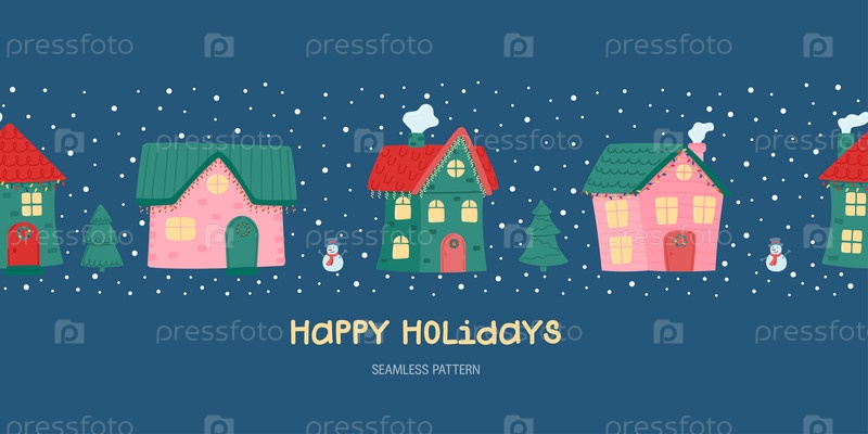 Счастливых праздников. Бесшовный горизонтальный узор. Милые зимние домики