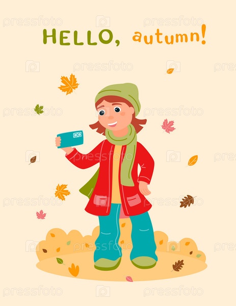 Плакат А4 с надписью Привет, осень. Счастливая девушка с телефоном в руках делает селфи