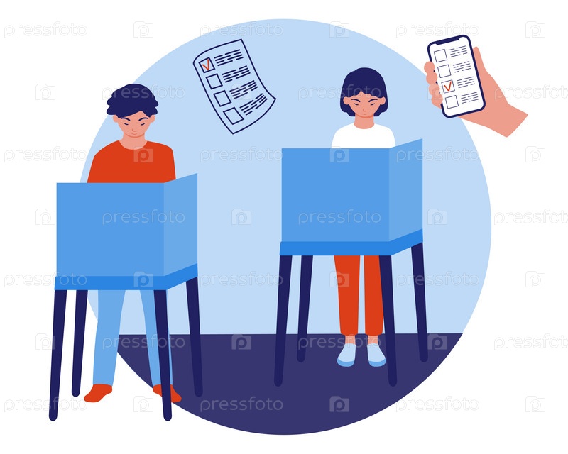 Девочка и мальчик в кабинке для голосования делают свой выбор. Голосование онлайн