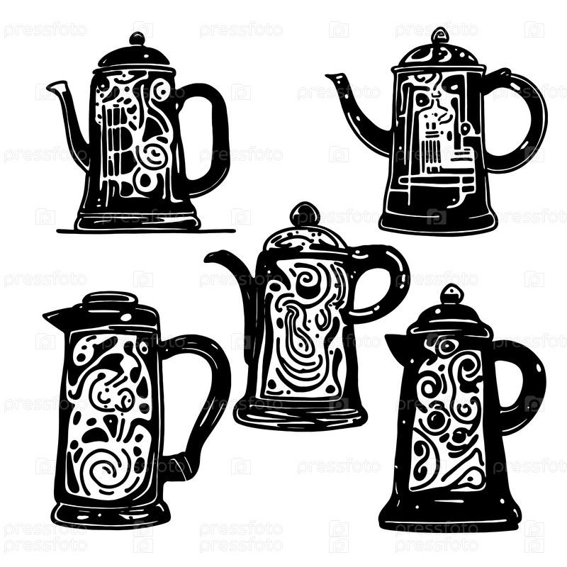 Набор иконок из черно-белых чайников для заваривания чая с различными узорами и формами