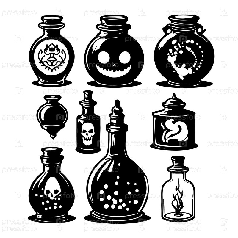 Маленькие красивые алхимические бутылочки для магических зелий. Значки для черно-белых бутылочек с электронной жидкостью или магического кристалла или артефакта