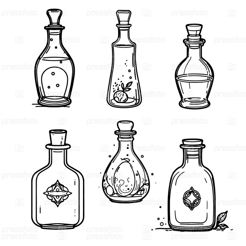 Маленькие красивые алхимические бутылочки для магических зелий. Значки для черно-белых бутылочек с электронной жидкостью или магического кристалла или артефакта