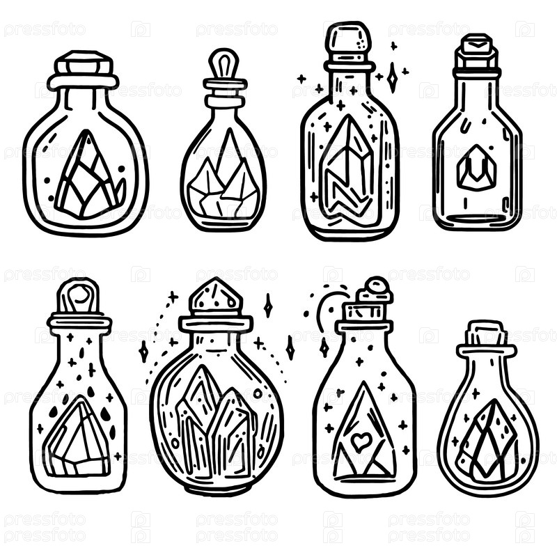 Маленькие красивые алхимические бутылочки для магических зелий. Значки для черно-белых бутылочек с электронной жидкостью или магического кристалла или артефакта