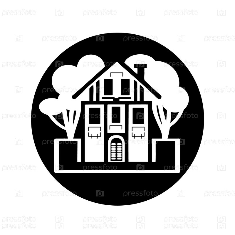 Эмблема дом или коттедж. Значок представляет собой большой частный дом с деревьями. Монохромное изображение двухэтажного частного здания