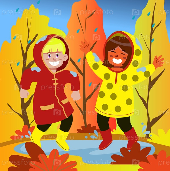 Дети в капюшонах и плащах радостно прыгают в луже на фоне осеннего пейзажа с апельсиновыми деревьями и дождем