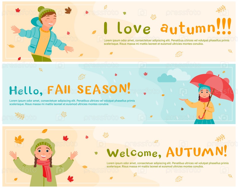 Набор баннеров. Группа детей гуляет на улице осенью. Девочки и мальчики играют с падающими листьями