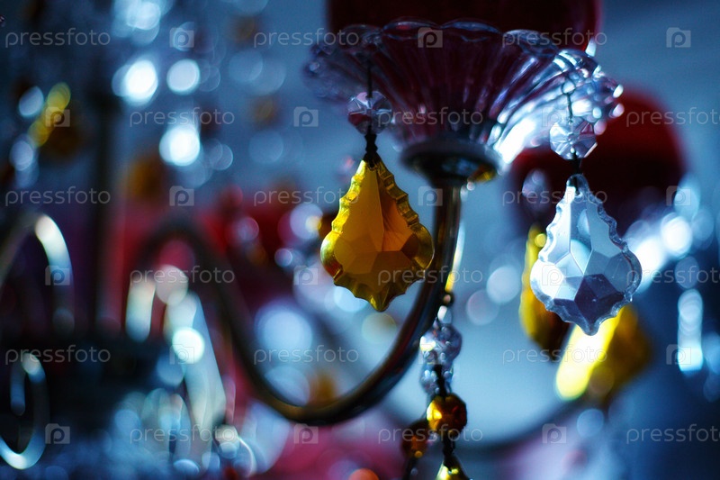 Абстрактная темная фотография с люстрой и канделябрами, увешанными венецианским хрусталем разных цветов. красивые увесистые кусочки стекла в виде кристаллов. декор комнаты в античном стиле и дизайн интерьера шкафы фото