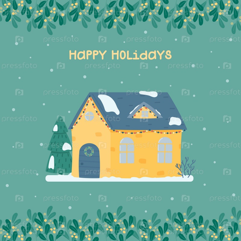 Открытка с праздниками. Милый рождественский и зимний домик. Детский украшенный домик