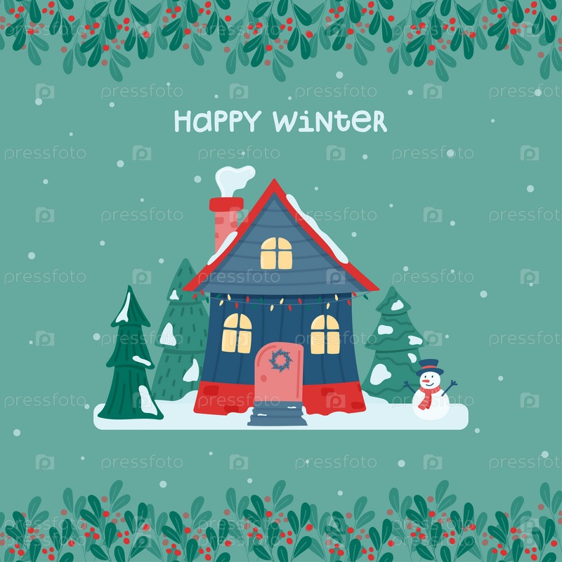 Счастливой зимы. Милый рождественский и зимний домик. Детский украшенный домик