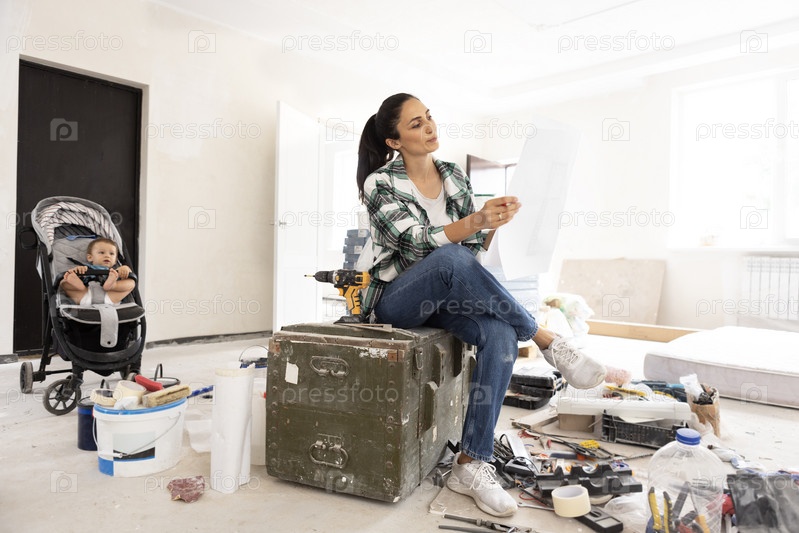 Молодая озадаченная мать с планом дома сидит на коробке среди строительных материалов и инвентаря. Маленький ребенок в коляске во время ремонта