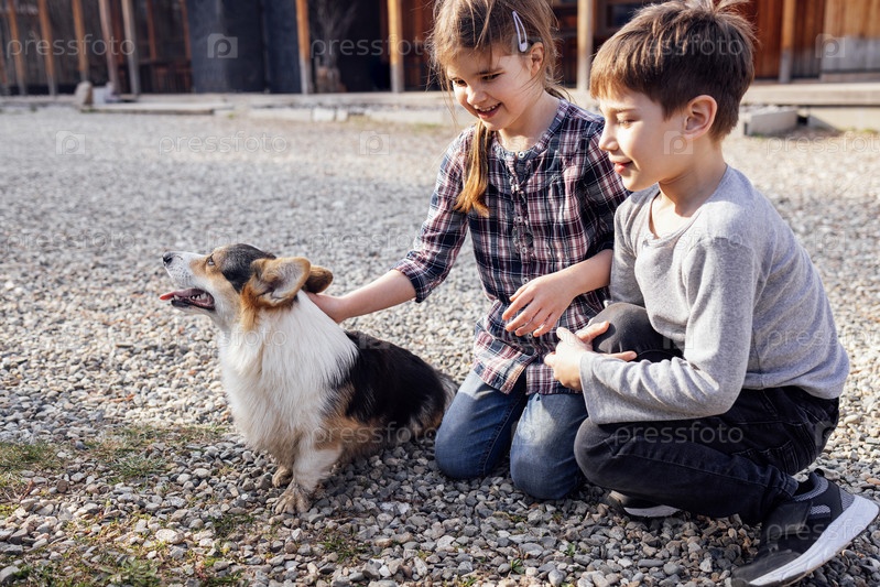 Маленькая девочка и мальчик гладят своего щенка корги на улице. Милые дети в повседневной одежде смеются и играют со своей собакой