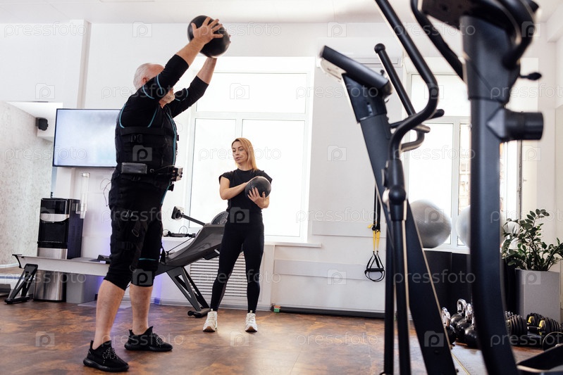 Пожилой мужчина в костюме для ЭМС тренируется с персональным фитнес-инструктором в современном светлом тренажерном зале