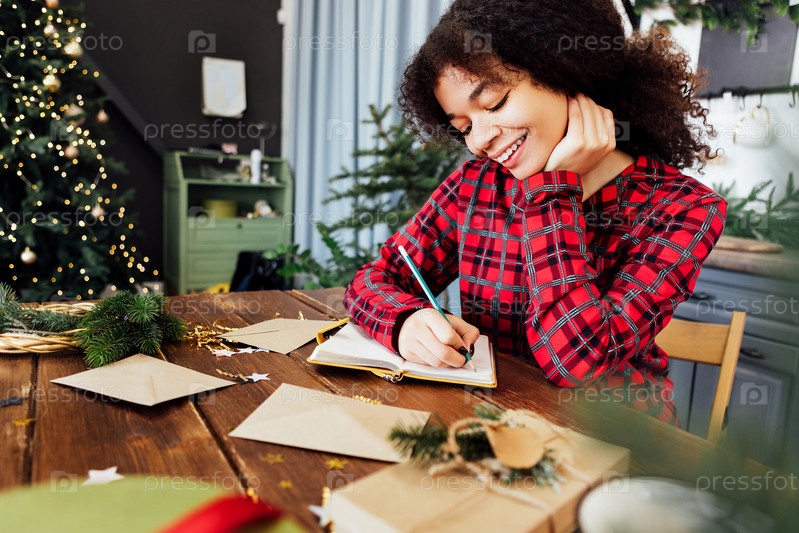 Радостная молодая африканская женщина в клетчатой пижаме сидит за столом и подписывает новогодние поздравительные открытки