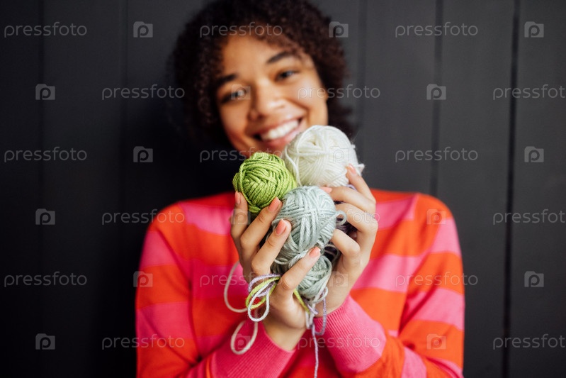 Крупный план улыбающейся африканской женщины с клубками разноцветной пряжи. Радостная чернокожая девочка в ярком полосатом свитере стоит на темном фоне и держит нитки для вязания. Рукоделие