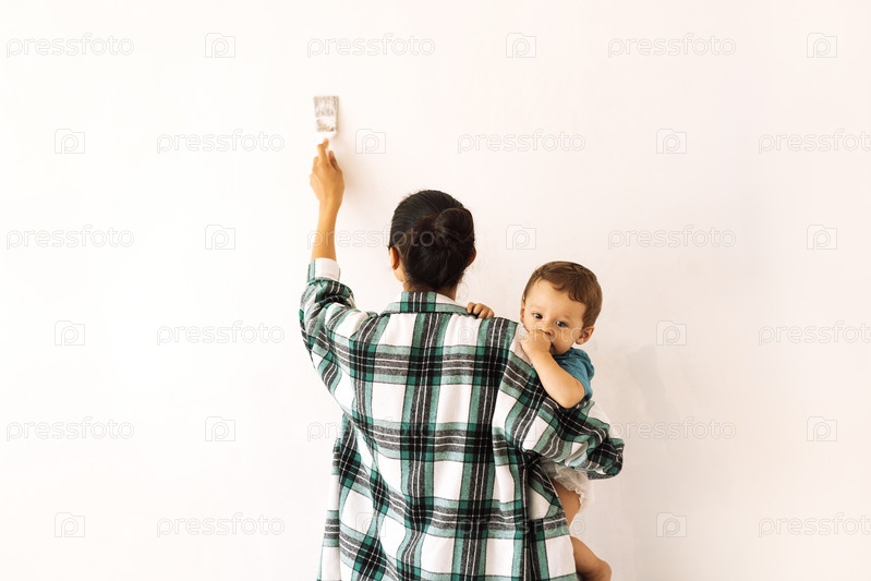 Молодая женщина держит ребенка и красит стену. Вид со спины. Мать с маленьким ребенком делает ремонт в квартире