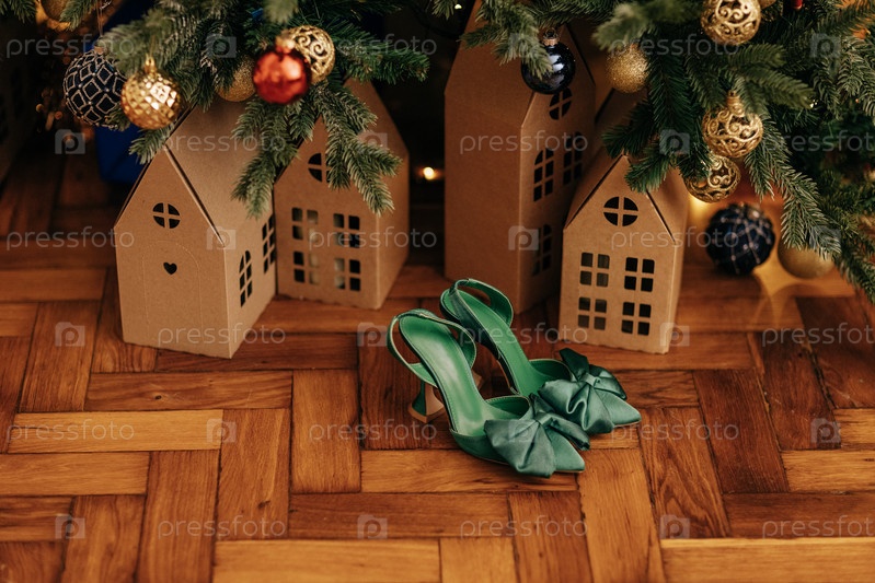 Новогодние украшения и красивые зеленые женские туфли на высоком каблуке под украшенной елкой. Женская обувь и милые ремесленные домики на деревянном паркете в гостиной дома