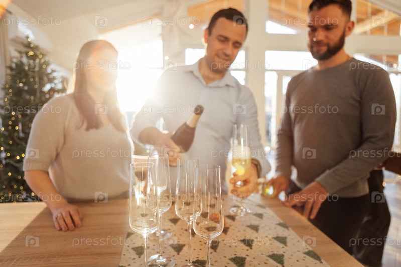 Улыбающийся молодой человек разливает шампанское по бокалам в столовой дома