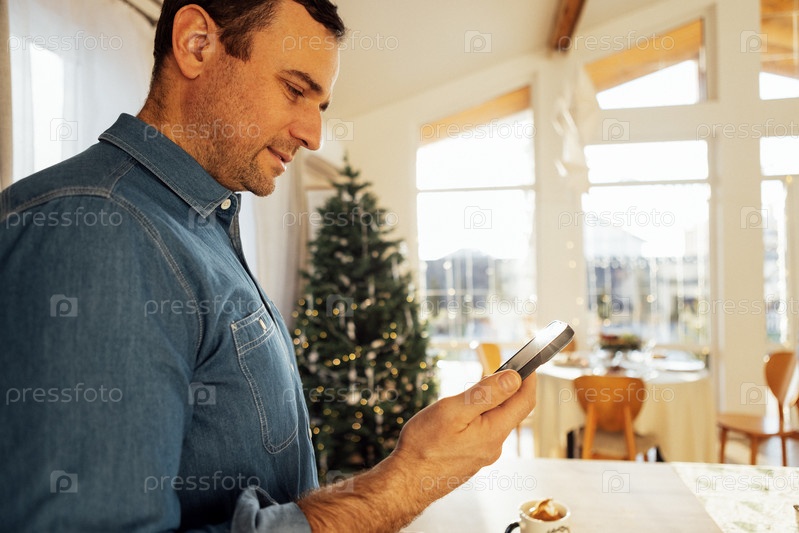 Привлекательный мужчина в джинсовой рубашке готовит еду на домашней кухне
