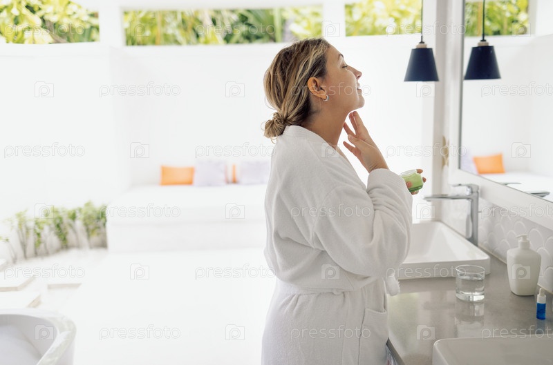 Молодая женщина в белом халате наносит крем на шею в ванной. Дама смотрит в зеркало. Улыбающаяся девушка ухаживает за кожей лица и тела дома