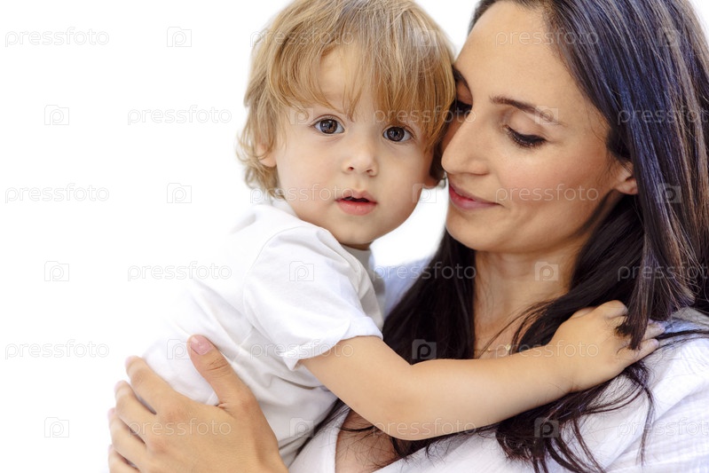 Крупный план милого младенца с очаровательной мамой в повседневной одежде. Молодая привлекательная женщина улыбается и обнимает своего маленького сына. Брюнетка держит удивленного милого ребенка