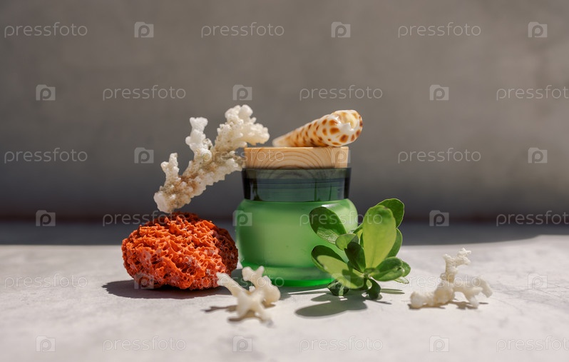 Зеленая косметическая баночка с деревянной крышкой окружена натуральными морскими элементами