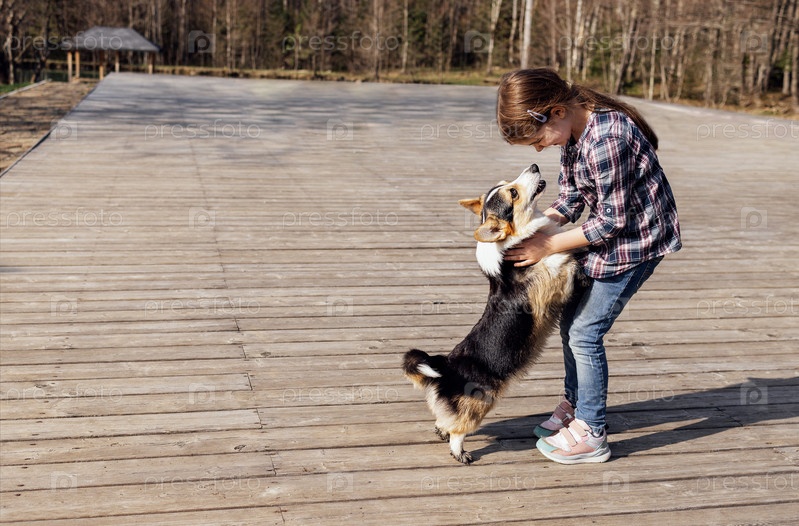 Маленькая девочка обнимает своего щенка корги на улице. Милый ребенок в повседневной одежде смеется и играет со своей собакой на деревянной платформе
