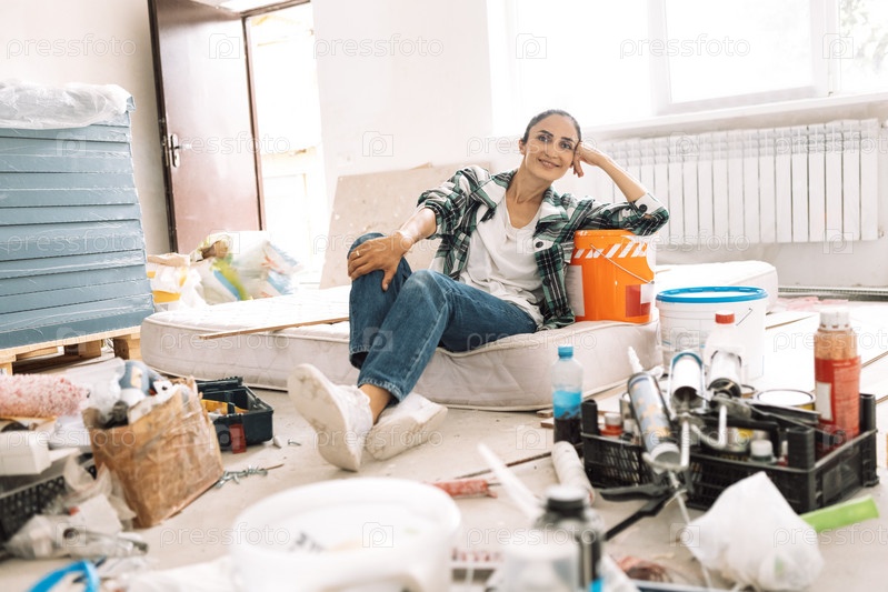 Молодая женщина сидит на матрасе среди строительных материалов и инвентаря. Очаровательная девушка в повседневной одежде думает о ремонте дома