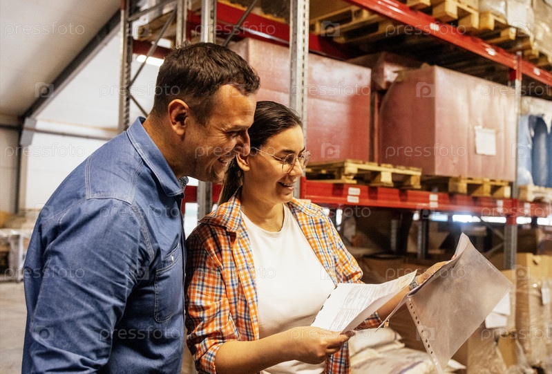 Улыбающиеся женщина и мужчина в повседневной одежде работают на складе. Молодая пара сотрудников смеется и отмечает наличие хранения продукции в цехе