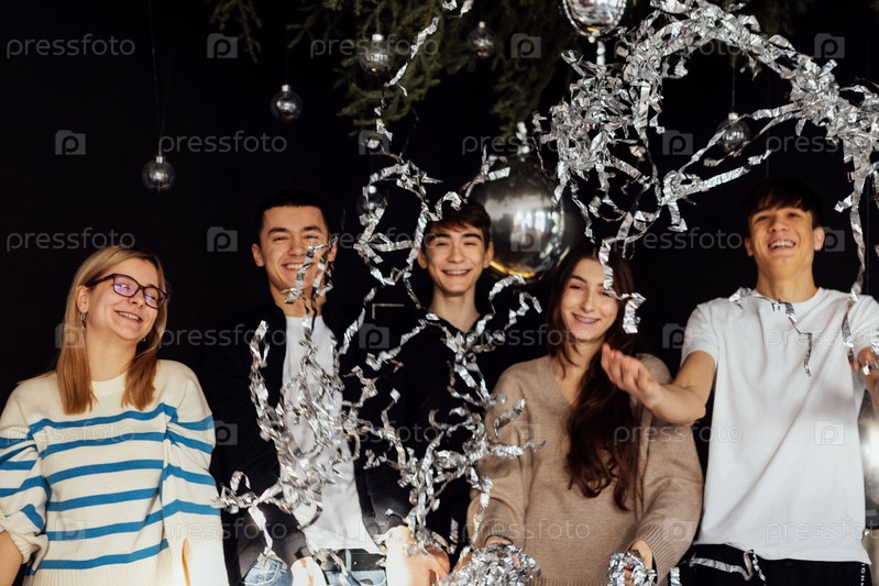 Улыбающиеся подростки бросают серебряные конфетти. Милые девочки и мальчики веселятся вместе