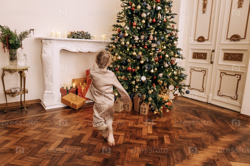 Маленькая девочка в пижаме бежит к елке, чтобы распаковать подарки. Милый ребенок счастлив и прыгает около украшенной елки в гостиной. Празднование нового года дома