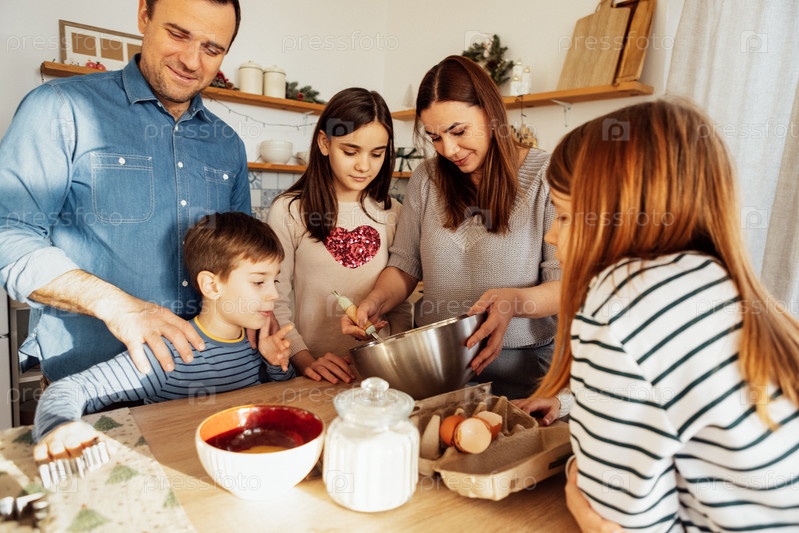 Веселая супружеская пара и их милые дети готовят вместе на кухне дома. Молодой человек добавляет сахар в миску. Девочка-подросток взбивает яйца венчиком. Большая счастливая семья. Уютный интерьер с рождественским декором