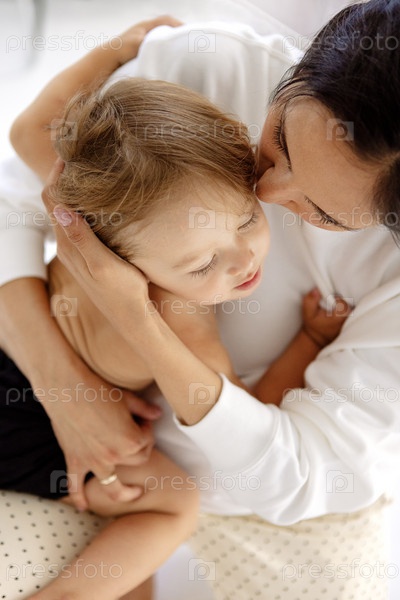 Крупный план милого младенца с очаровательной мамой в повседневной одежде. Молодая привлекательная женщина целует и обнимает своего маленького сына. Вид сверху. Брюнетка держит милого мальчика