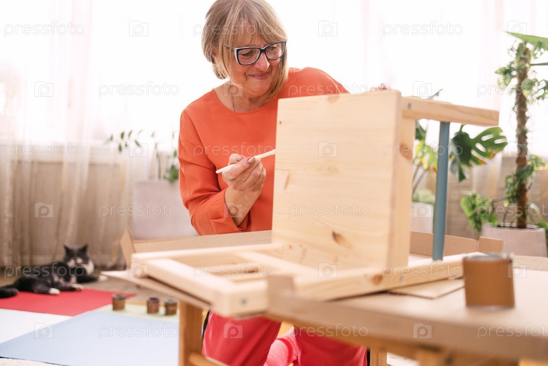 Пожилая женщина в оранжевой повседневной одежде красит деревянный стул в гостиной. Зрелая женщина в очках делает мебель